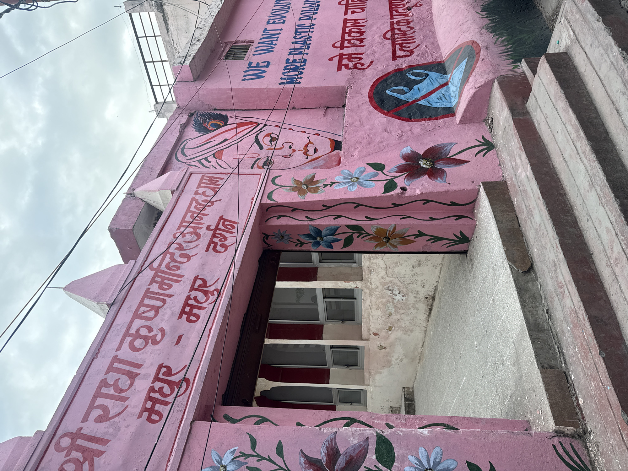 A low-angle shot depicts the pink facade of the Shree Radha Krishna Mandir Anand temple in Mathura, India. The building features artwork, including a woman's face and floral designs. Inscriptions in Hindi and English are visible, reading "Shree Radha Krishna Mandir Anand Mathura" and "We Want Evolution More Plastic Pollution". A symbol indicating "no plastic" is also displayed. The photograph is taken from a staircase leading up to an entrance. The sky is overcast. The immediate environment includes aged walls and stairs, suggesting a well-worn location.
