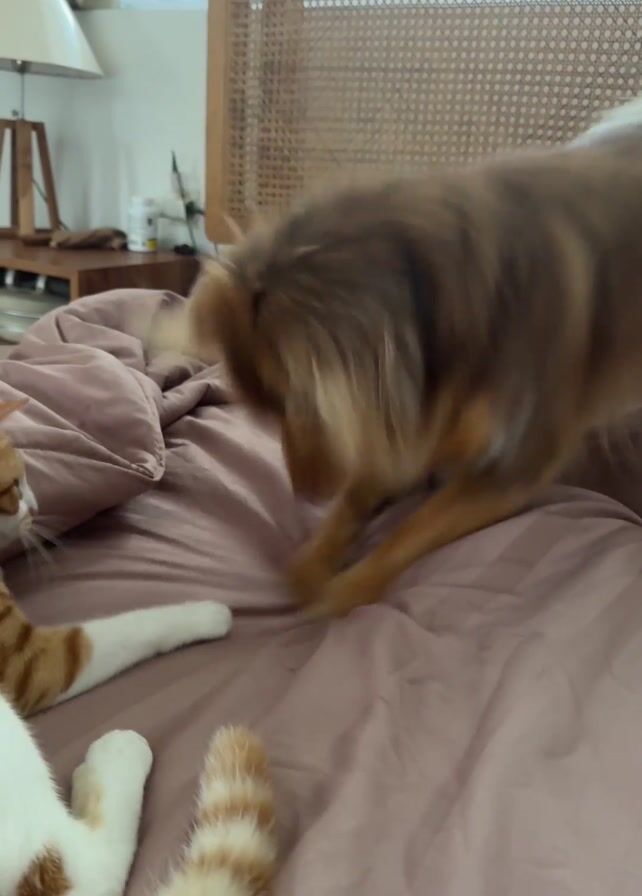 An orange and white tabby cat lies on a bed covered in a purple duvet. A small, long-haired dog with brown fur stands on the bed in front of the cat. The dog seems to be playfully pouncing or nipping towards the cat, then stopping and looking at it. The dog is wearing a pink collar. The cat is lying down, watching the dog. In the background, a wooden headboard is visible, along with a lamp and a side table with items on it. A window with sheer curtains is also in the background.