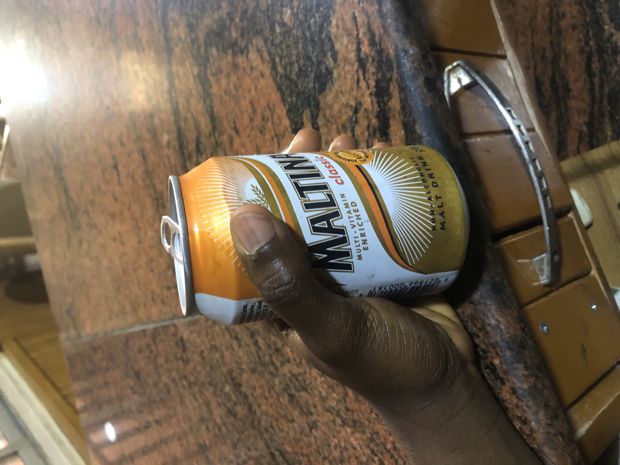 A dark-skinned human hand firmly grips an unopened 33cl aluminum can of Maltina Classic, a non-alcoholic multi-vitamin enriched malt drink. The can is primarily orange and white with black lettering, featuring a pull tab that remains intact at the top. The scene is set against a polished, dark reddish-brown granite or marble countertop. Below the countertop, a section of light brown wooden cabinetry is visible, adorned with at least two silver-colored, possibly metallic, decorative handles. Light reflections are present on both the can and the countertop, indicating an illuminated indoor environment. This scene is located in Sabon Gari Nassarawa, Nigeria.