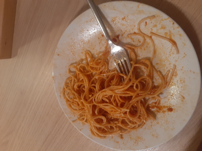 - "A white plate holds a portion of spaghetti coated in red sauce, with a few loose strands scattered around" by FM-Ohb2l1, licensed under CC BY 4.0