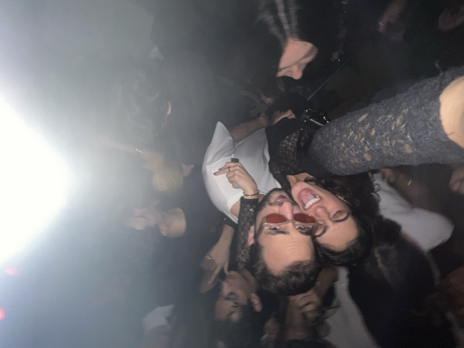 In a dimly lit, crowded setting, a woman in a black lace top and a man with sunglasses pose for a selfie. The woman's mouth is open in a yell, and the man smiles. Other people surround them, some blurry. One person wears a white shirt and holds a drink. The overall atmosphere is lively and social. A light source to the left is out of focus.