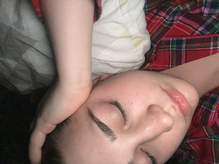 A close-up captures a woman lying down with her eyes closed. She rests her head on her hand, which is placed on a gray patterned surface. A white pillow with a faint pattern is partially visible. The woman is dressed in red and black plaid pajamas. The composition focuses on her facial features, including her eyelashes, nose, and lips.