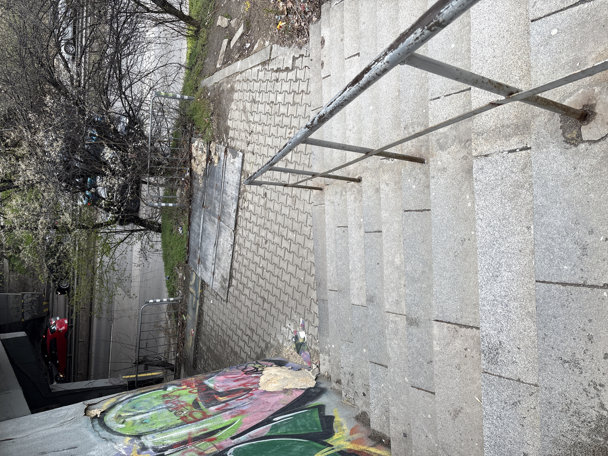 view from a high point looking down at a set of concrete stairs with a metal railing, which lead down to a street with trees and a red car. Graffiti is visible on the ledge where the photo was taken. A cobblestone walkway is adjacent to the stairs. The location is in Sofia, Bulgaria, indicated by the specific style of cobblestone used for the walkway.