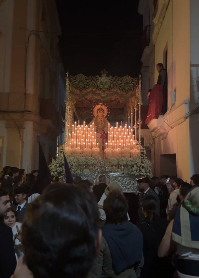 religious procession at night. A statue of Jesus Christ adorned with candles is carried down a narrow street, surrounded by a crowd of onlookers. The street is lined with buildings, and a person is visible on a balcony. The focus is on the religious image and the solemn atmosphere of the event. The scene is illuminated primarily by the light of the candles and the streetlights.