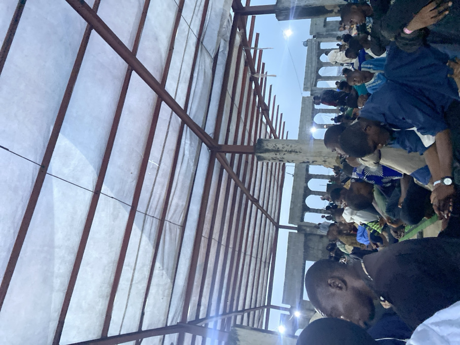 An outdoor prayer service is in progress under a rudimentary shelter with a white fabric roof supported by a metal frame
