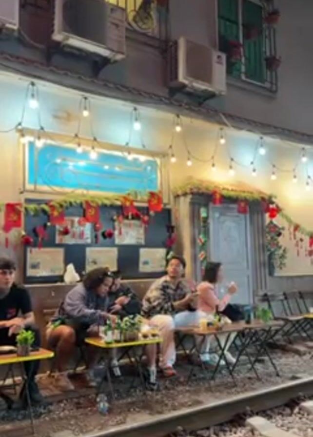 group of five people seated at tables on a railway track in front of a building. The building is adorned with string lights, flags, and floral decorations. There are air conditioning units mounted on the exterior walls. The people are dressed casually and appear to be conversing and eating. Each table has beverages and small potted plants. The overall ambiance suggests a relaxed outdoor dining setting in an urban environment.