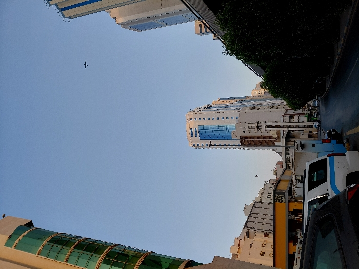 street scene with tall buildings on either side. A bird flies in the clear blue sky. A beige building with a curved green glass roof is visible at the bottom left. On the right, there is a street with parked cars and a sidewalk, partially shaded by trees. The buildings are a mix of light colors, and a tall hotel-like structure features blue windows. The image is slightly rotated.