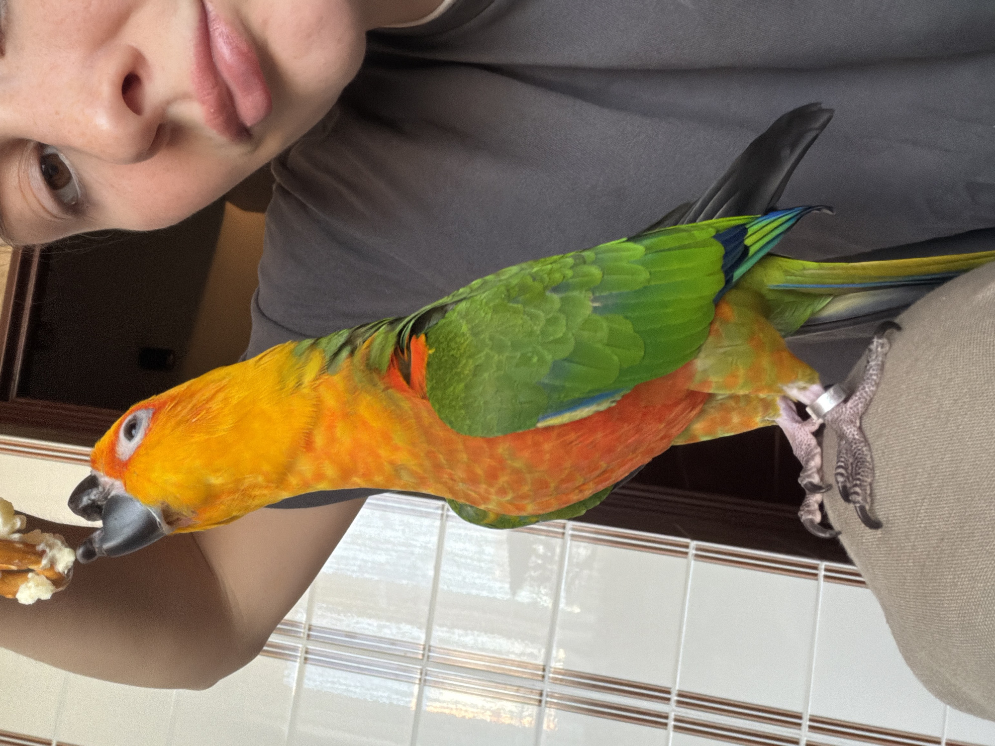 - "A person holds up a treat, possibly food, to a colorful parrot perched on their arm" by FM-e1BLf2, licensed under CC BY 4.0