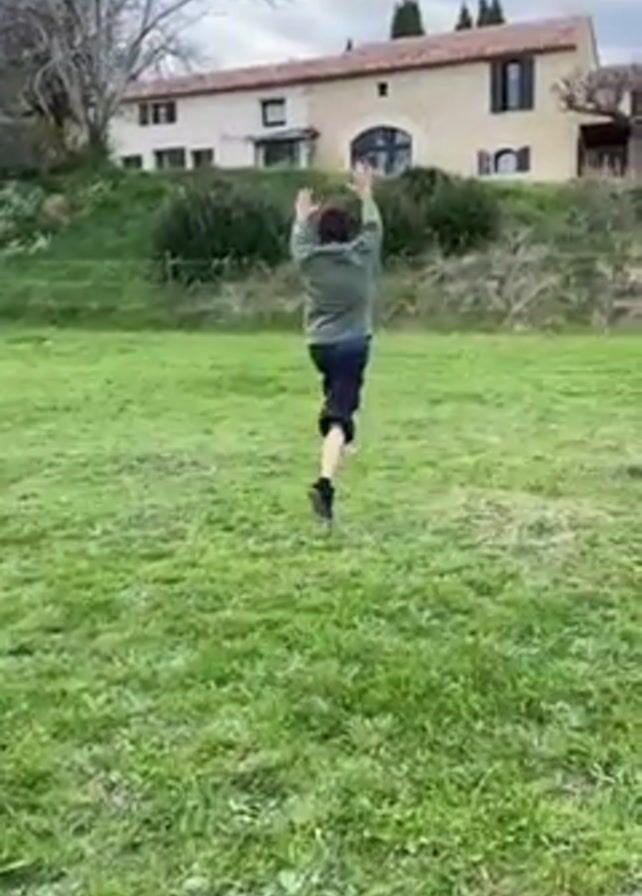 A person with dark, curly hair, wearing a green sweatshirt and dark pants and shoes, runs toward the camera across a grassy field, attempts a forward roll, and lands awkwardly in a seated position