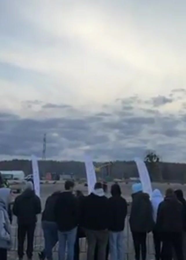 The video captures a group of people standing behind a low barrier, looking towards a yellow helicopter taking off from a paved area. There are multiple white banners with a logo, and a tall metal tower in the background, as well as trees. The sky is filled with gray clouds. One person has a child on their shoulders for a better view. The helicopter is the focal point and is seen ascending against the cloudy sky. The people are diverse in their attire, mostly wearing casual clothing suitable for an outdoor event.
