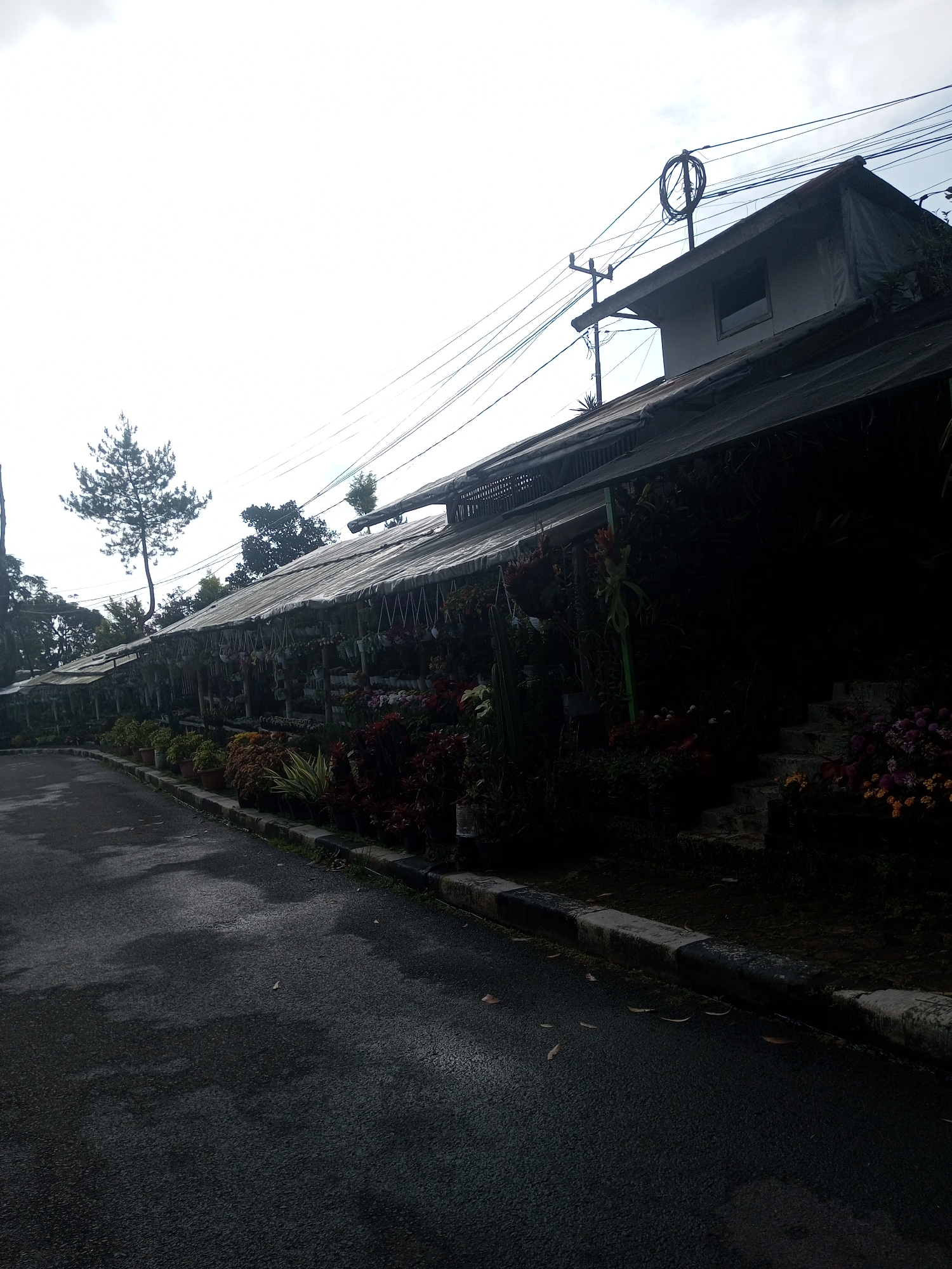 The image depicts a street scene in what appears to be a plant nursery or flower shop setting