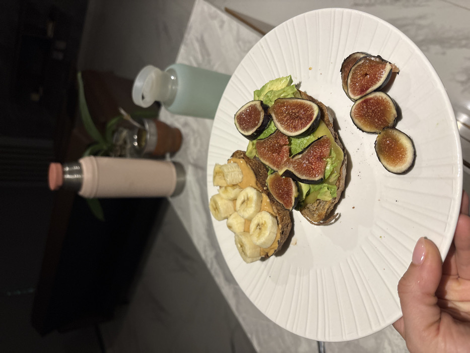 The image displays an indoor scene, likely a domestic setting. In the lower-left foreground, a left hand with light pink manicured fingernails holds a round, white ceramic plate featuring a textured, ribbed rim. The plate holds two slices of toasted bread; one is topped with a light brown spread and multiple slices of banana, while the other is covered with green leaf lettuce or avocado slices and several halved fresh figs, revealing their reddish-purple interiors. Additional fig halves are scattered directly on the plate. In the mid-ground, resting on a light-colored, possibly marble-patterned table, are a pink thermal bottle with a silver base, a brown mate cup containing a metal straw, and a light blue glass bottle with a white plastic cap. A small green potted plant is partially visible behind the bottles. The background is blurred and dark, showing a portion of a dark-colored sofa or couch. The specific location within Mexico City, Mexico, is not discernible from the visual information provided.