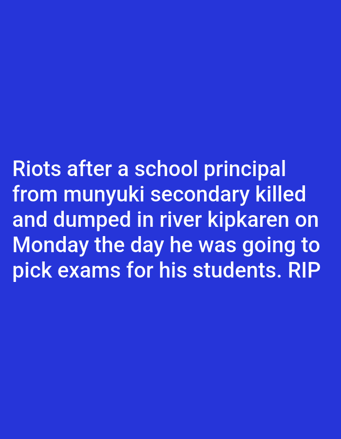 The image displays white sans-serif text centered against a solid royal blue background. The text reads: "Riots after a school principal from munyuki secondary killed and dumped in river kipkaren on Monday the day he was going to pick exams for his students. RIP". This text describes an event in the Lumakanda ward, Kenya, involving the death of a principal from Munyuki Secondary School. The principal's body was reportedly found in River Kipkaren. This incident occurred on a Monday, coinciding with the principal's scheduled task of collecting exams for students. The described events subsequently led to "Riots." The concluding "RIP" is a posthumous tribute. No visible subjects, objects, or actions beyond the text itself are depicted in the image.