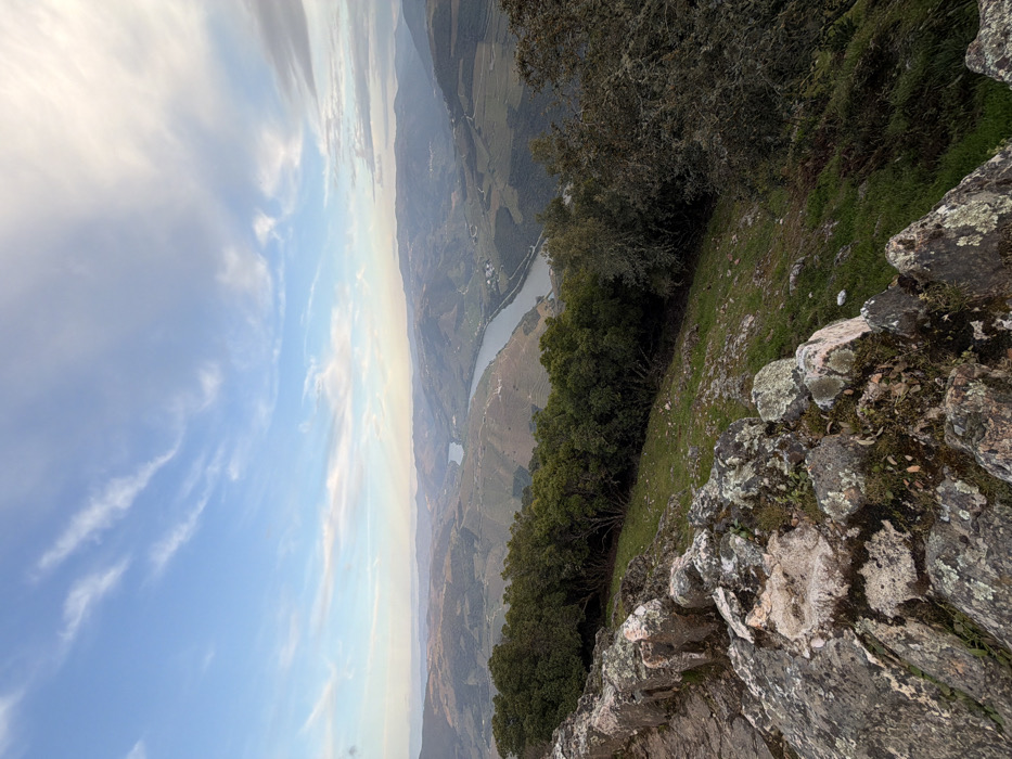 The image displays an elevated panoramic view of the Douro Valley, specifically overlooking the city of Peso da Régua, Portugal. In the immediate foreground, a weathered stone barrier, composed of irregularly shaped rocks with visible moss and lichen, forms a low retaining wall running from the lower left towards the center. Beyond this barrier, a steep grassy slope with scattered foliage descends into a dense line of dark green trees that partially obscure the drop-off. The midground and background reveal the wide Douro River, curving through the valley. The river's surface is relatively calm, reflecting the sky in areas. The surrounding hillsides are extensively terraced, indicative of vineyard cultivation, with distinct patterns visible on the slopes. Scattered buildings and small settlements are discernible amidst the terraced landscape. Multiple layers of hills extend into the far distance, gradually fading into a light blue atmospheric haze. The sky above occupies approximately the top half of the frame, featuring a light blue hue with scattered white, wispy cirrus and broader stratocumulus clouds. The overall lighting suggests either early morning or late afternoon conditions, with a soft illumination across the scene. No individuals or active subjects are present in the frame.