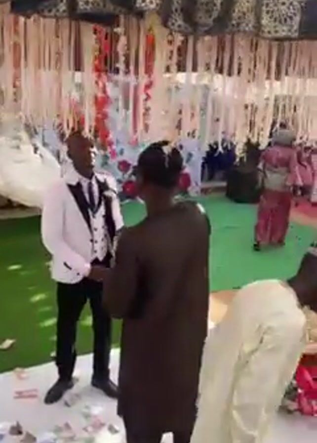 The video depicts an outdoor celebration, likely a wedding reception, taking place under a decorated canopy. Several people are visible, with a man in a white suit and vest standing prominently. Another man in a brown suit is throwing money into the air. Other individuals can be seen standing, sitting, and walking around in the background, some wearing traditional attire. There is a small green patch on the ground, and red and white floral arrangements are present. The floor around the primary action is covered with scattered paper currency. The general atmosphere suggests a lively and celebratory event.