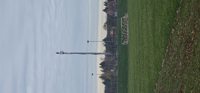 This image displays an outdoor sports field in Kamenz - Kamjenc, Germany, under an overcast sky. The foreground consists of a green grass pitch, with scattered brown leaves visible, particularly along a diagonal section in the lower left. In the midground, a soccer goal with a white frame and a camouflage-patterned net is positioned on the field, slightly to the right of the center. Behind the goal and field, an elevated grassy embankment is present. Above this embankment, two dark lamp posts with luminaires extend upwards, flanking a line of deciduous trees displaying sparse, autumn-colored foliage. In the background, a tall, slender cellular or radio tower dominates the skyline, featuring alternating red and white stripes near its apex and equipped with multiple antennae. To the right of the tree line and tower, several buildings with reddish-brown roofs are partially visible, indicating a residential area. The sky is uniformly gray and cloudy. No individuals are present in the scene.