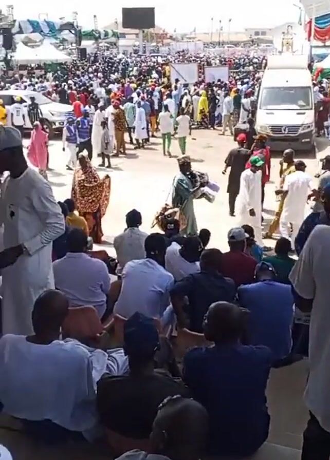 large gathering of people in an outdoor area. Many are seated in rows of chairs, while others stand or walk around. There is a white van in the middle of the crowd and several cars visible in the background. Some individuals are dressed in traditional attire, including white robes and hats, while others wear casual clothing. A man in a white robe and gray hat is interacting with people in the seated area, handing out what appears to be a small item or card. The scene seems to be a public event or rally, possibly with a political or ceremonial purpose. There are tents or structures covered in colorful decorations.