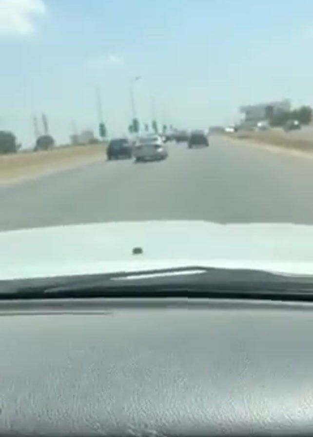 drive on a highway from inside a car. The road is straight and has multiple lanes with cars traveling in both directions. The sky is blue with light clouds. The highway has streetlights lining both sides. The dashboard of the car is visible at the bottom of the frame. The video seems to have been taken on a clear, sunny day.