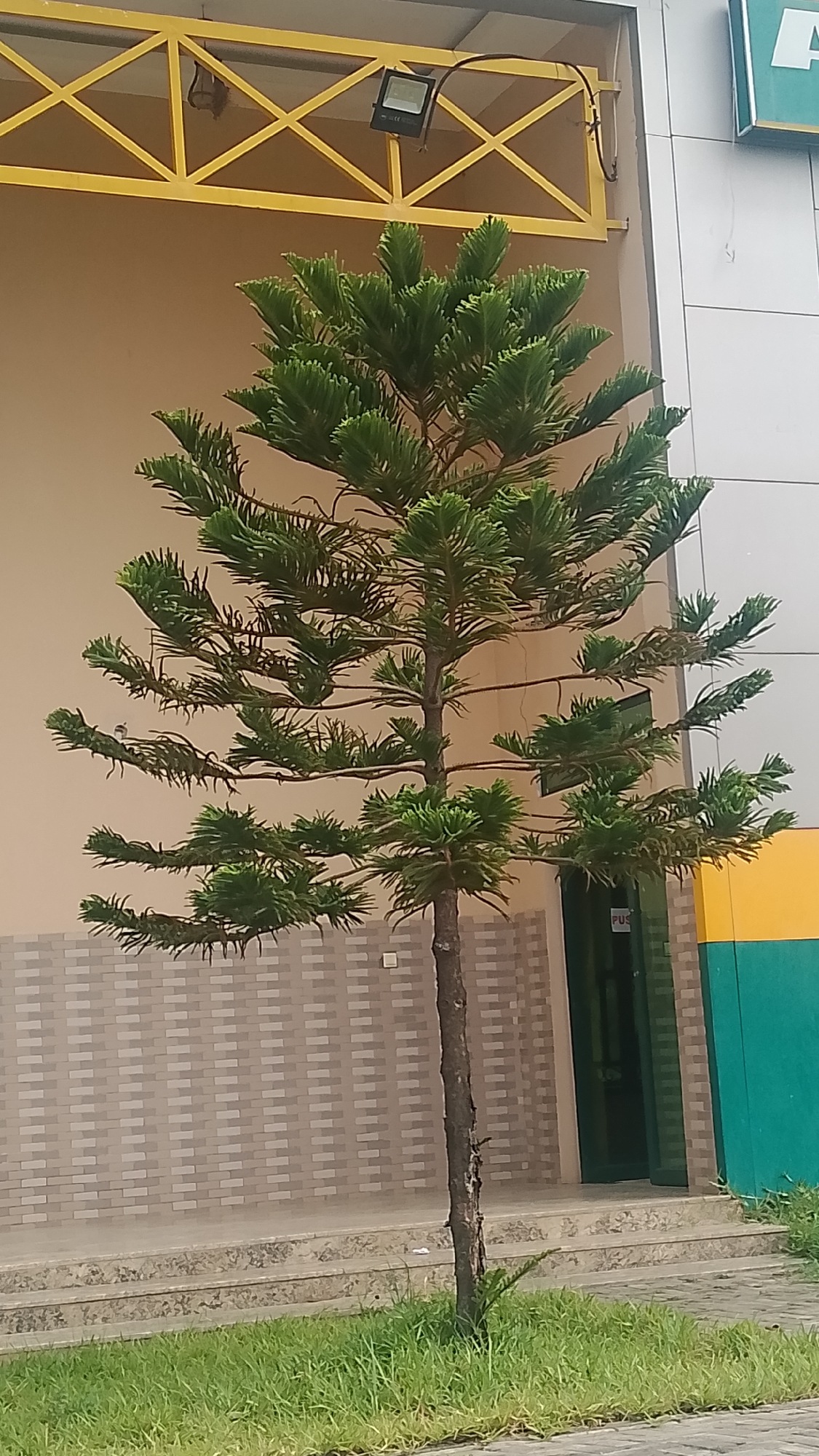 green tree planted on a lawn in front of a building. The building has a tan colored facade and a gray brick wall. There is a yellow railing structure above the tan facade, and a gray section of the building to the right. The location is in Immigration Quarters, Nigeria. There are no people visible in the image.