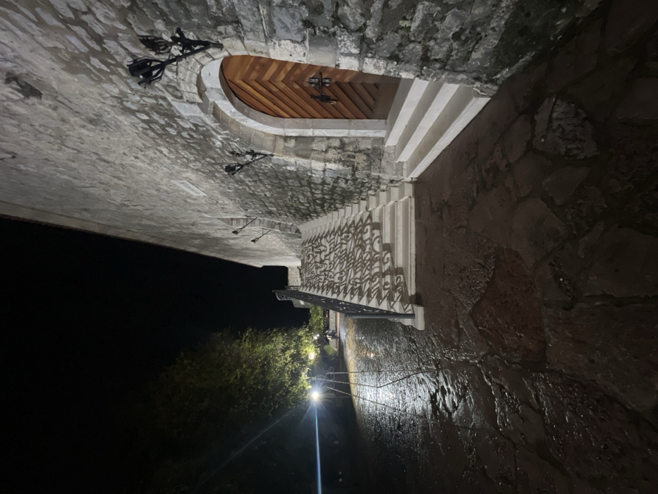 A low-angle shot depicts a stone archway with a wooden door leading to white stairs. A decorative wrought-iron railing borders the stairs. To the left, a dark, textured wall extends upwards. Below, there's a glimpse of trees and a street light reflecting on a damp stone surface. The lighting is dim, creating dramatic shadows across the scene. The photograph is rotated, giving a disorienting, tilted perspective.