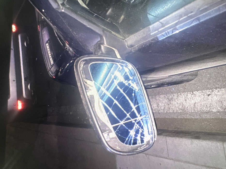 The scene depicts a dark-colored vehicle, likely dark blue or black, parked on an asphalt surface adjacent to a concrete curb with a white road marking. The driver's side wing mirror of this vehicle is severely damaged, with the mirror glass shattered into multiple intersecting cracks, obscuring its reflective surface. A distorted, blueish reflection is visible within the fractured mirror. In the background, the rear section of a lighter-colored, possibly silver, SUV or crossover is partially visible, displaying two illuminated red taillights and a portion of its rear bumper and lower tailgate. The primary vehicle's hood reflects a Bulgarian license plate that includes the characters "EH4XXXX". No individuals or active interactions are present. The environment suggests outdoor, possibly nighttime conditions due to the dim lighting. This scene is located in Reselets, Bulgaria.
