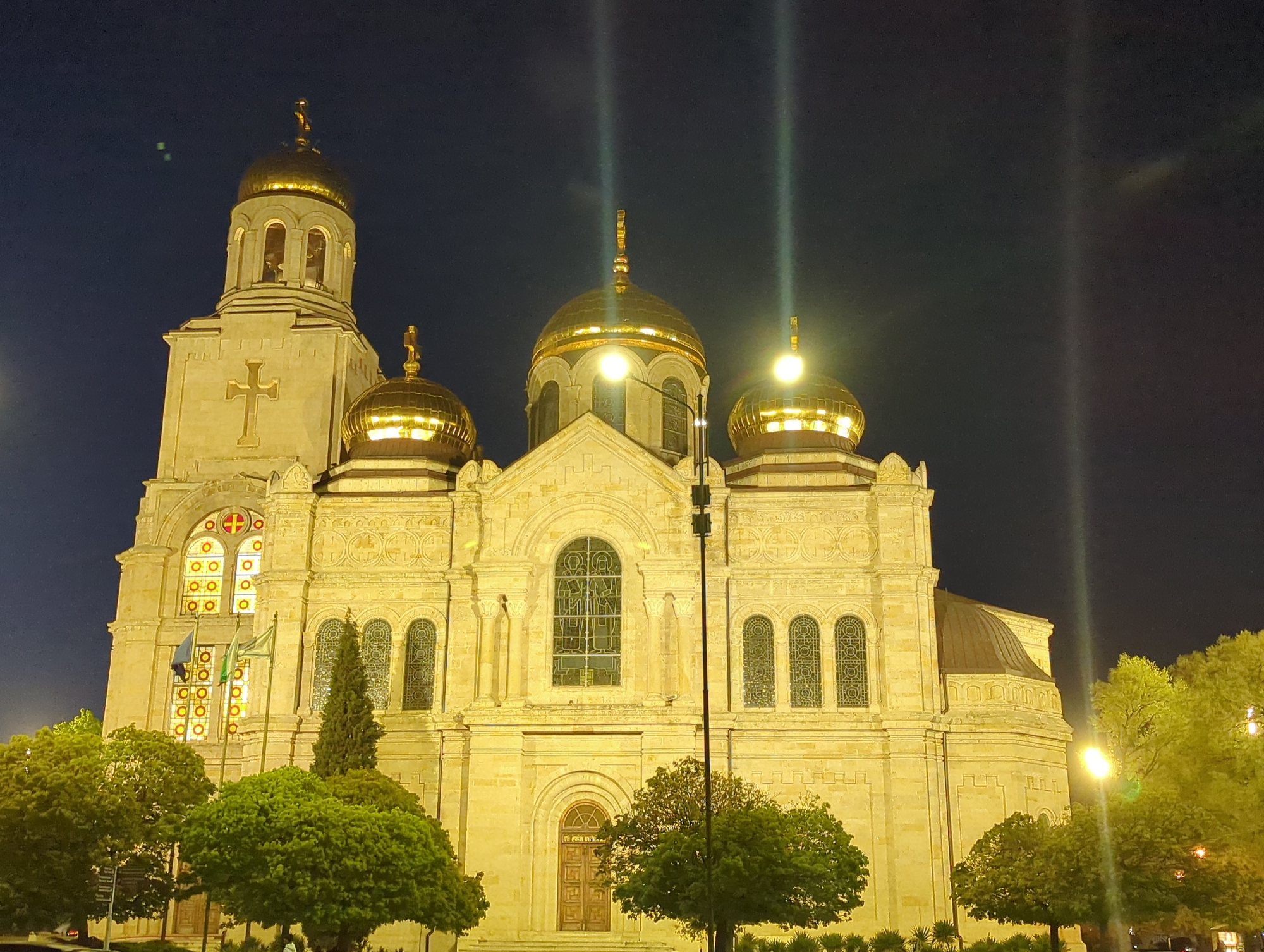 At night, an illuminated Orthodox Christian cathedral with golden domes stands prominently against a dark sky. The Cathedral of the Assumption of the Virgin, located in Varna, Bulgaria, is constructed of light-colored stone and adorned with multiple windows. A tower featuring a cross is visible on the left side. Flags flutter near the base of the tower. Streetlights cast vertical beams of light above the structure. Trees line the base of the building. The environment is urban, indicated by the presence of street lighting. No people are visible.