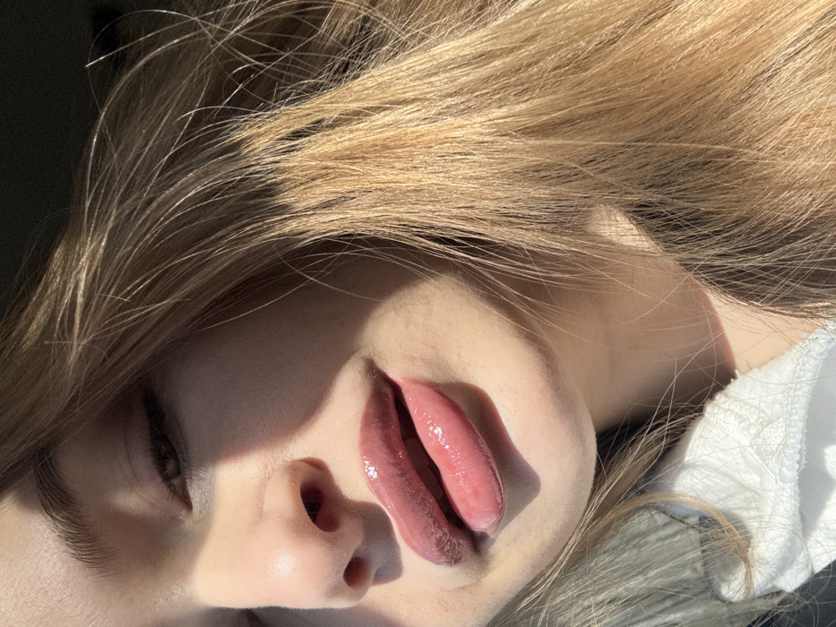 A close-up, angled portrait depicts an individual, presumably located in Podličak, Montenegro. The subject's light-toned skin is visible, with significant areas of the face, including the upper nose and the left side of the face (viewer's right), obscured by strong shadows cast by direct sunlight. The lower part of the nose is visible. The lips are full, glossy, and tinted with a pinkish-mauve color, slightly parted. Long, light brown or blonde hair, illuminated by direct sunlight, occupies the right side of the frame (viewer's left). A white garment with a visible textured or ribbed detail is present in the lower left corner. The background is dark and out of focus.