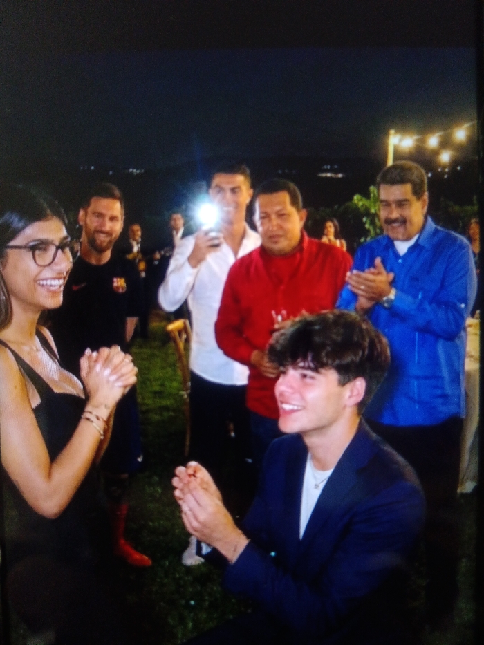 A young man in a blue suit kneels, clasping his hands, while a woman in a black dress and glasses claps, smiling at him. Behind them are several figures: Lionel Messi in a soccer jersey, Cristiano Ronaldo holding a phone with the flashlight on, Hugo Chávez in a red shirt, and Nicolás Maduro in a blue shirt, who is clapping. The scene appears to be an outdoor event at night with lights strung up in the background.