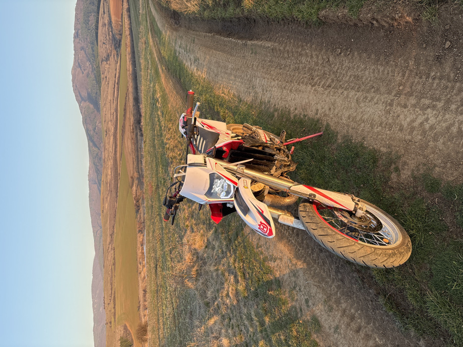 - "A white and red Husqvarna motorcycle, appearing to be a supermoto or enduro model with street-oriented tires, is parked on a dirt track in a rural area identified as the city of Dren, Bulgaria" by FM-USvwE2, licensed under CC BY 4.0