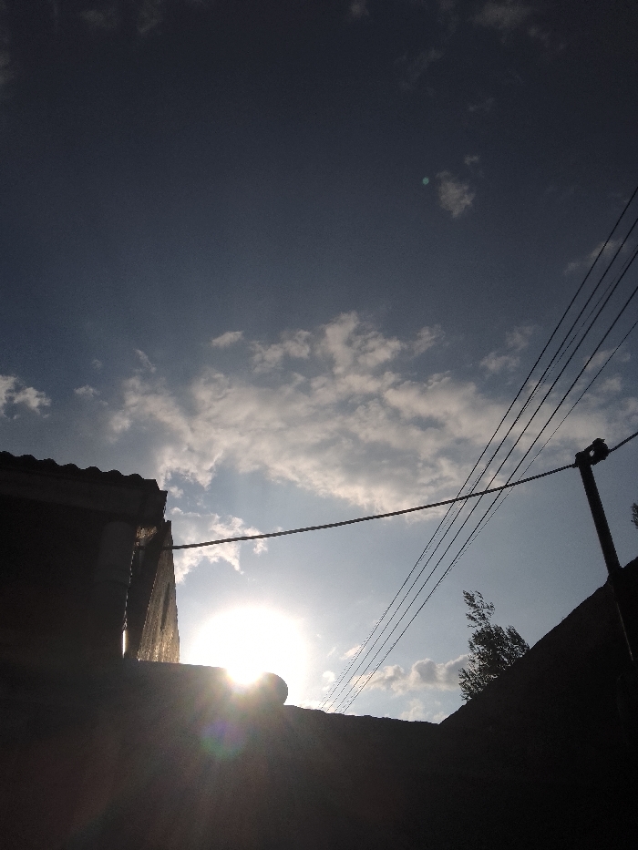 The image depicts an outdoor scene in Njoro ward, Kenya, captured with significant backlighting. The sun is prominently featured as a bright, circular disc with visible lens flare, positioned in the lower-center portion of the frame, suggesting either sunrise or sunset. The sky above is a light blue, partially covered by scattered white cumulus clouds. In the foreground, silhouetted elements dominate the lower half of the image. To the left, the dark silhouette of a building's roofline and upper wall is visible. To the right, a utility pole with at least five parallel overhead power lines extends diagonally across the sky. Below the power lines and pole, a dark, indistinct mass, possibly a distant structure or elevated ground, is present, with a small portion of a tree's canopy visible as a silhouette against the brighter sky. No individuals or specific actions are discernible.