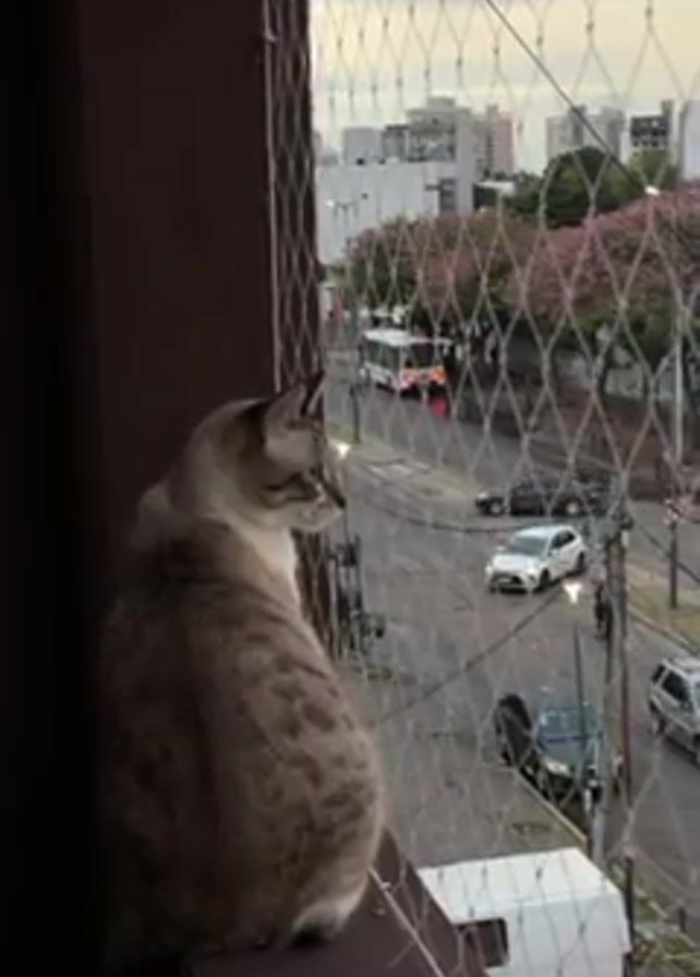 A cat with gray and tan coloring is sitting on a ledge, looking out the window. The window is covered with safety netting. Outside the window is a city street with cars and a bus driving by. There are trees with pink blossoms lining the street. The sky is overcast.