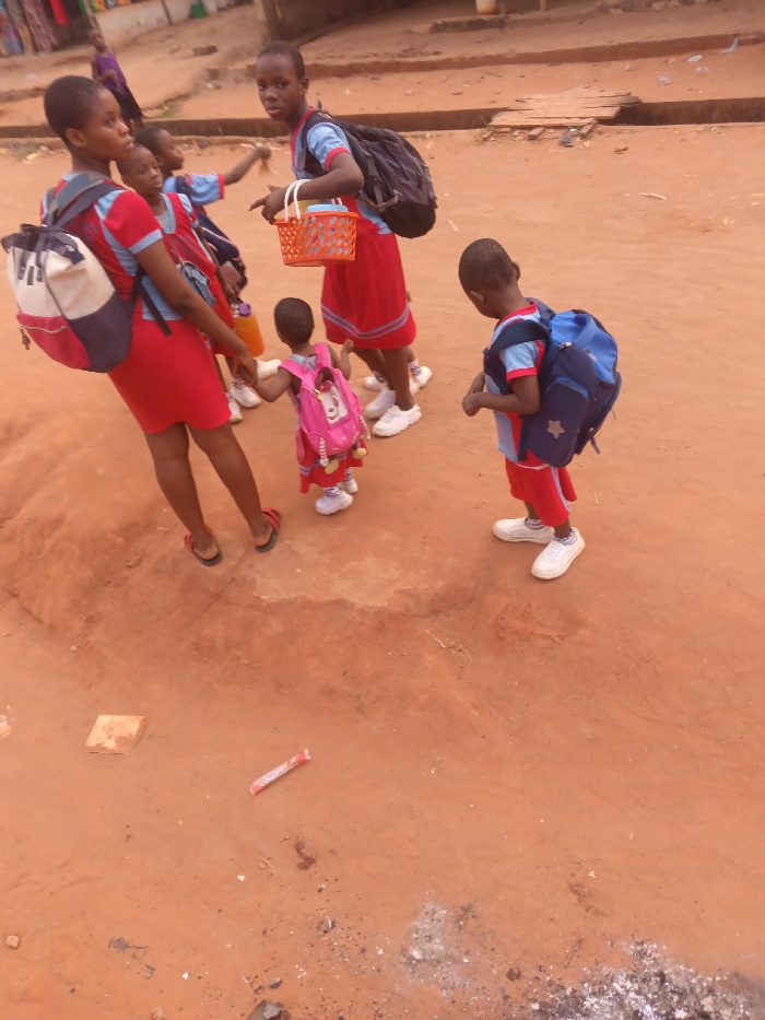 A group of children stand outdoors on a reddish-brown surface, likely a dirt or clay ground. They wear matching school uniforms, consisting of red dresses or shorts paired with blue and white striped shirts. The children carry backpacks of varying sizes and colors. One child holds a small orange basket. The scene appears to be a typical day of children walking, possibly to or from school.