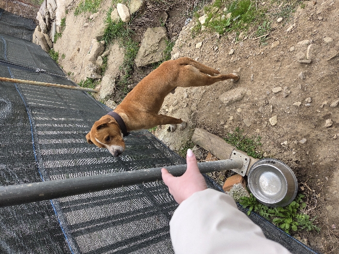 The image depicts an outdoor scene in Liliach, Bulgaria, featuring a tan and white dog, a human hand, and a black mesh fence. A medium-sized, short-haired dog with reddish-brown fur, white facial markings on its muzzle and chest, and a dark collar stands facing left in the midground. It is positioned to the right of a dark grey metal pole and in front of a black mesh fence. A human left hand, with fair skin and light pink nail polish, reaches towards the lower section of the metal pole from the lower-left corner of the frame. A silver-colored metal dog bowl containing water rests on the dirt ground directly adjacent to the pole's base. The background consists of a black mesh fence, appearing to be a privacy or shade barrier, supported by additional vertical posts. The ground throughout the scene is unpaved, composed of dirt and scattered rocks, with intermittent patches of green vegetation. A wooden plank lies horizontally on the ground near the base of the pole.
