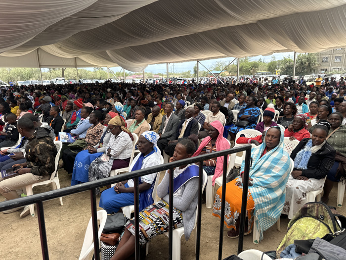 This image captures a large outdoor gathering of approximately several hundred individuals, primarily adults of African descent, seated under an expansive white tent canopy