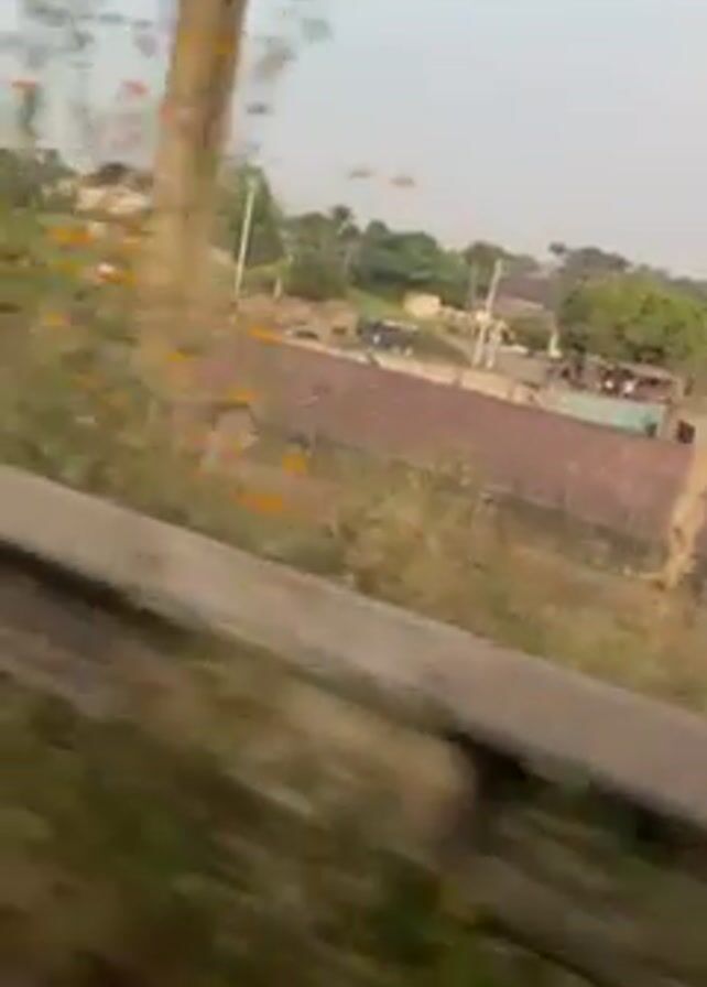 view from a moving vehicle. The scenery includes dry grass, some green trees, houses with tin roofs, and telephone poles. The sky is overcast. The camera is positioned behind a roadside barrier. A voice is heard in the background.