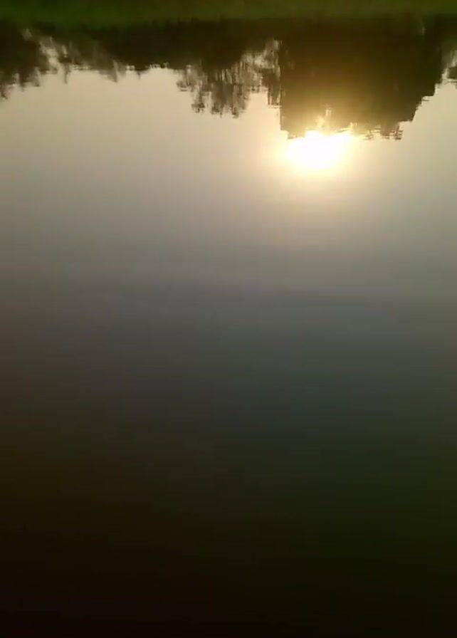 The video opens with a serene view of a body of water reflecting the sunlight, creating a shimmering effect. Green vegetation lines the banks of the water. The camera then pans to reveal a weathered, wooden boat. The interior structure of the boat is visible, with wooden planks forming a frame. The camera remains focused on the boat and the water ahead. The video then returns to the original scene of the sun reflecting on the water and the green landscape.
