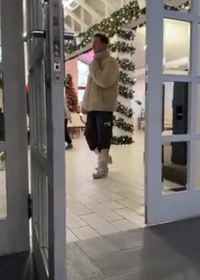 From the perspective of someone looking through a partially open white door, a man is seen walking on a tiled floor in a decorated indoor space. He is wearing a tan puffer jacket, dark pants, and ornate, glittery boots with a heel. The space is adorned with Christmas decorations including garlands with lights and ornaments. There are also columns decorated in a similar fashion. Other people, including a child, are visible in the background.