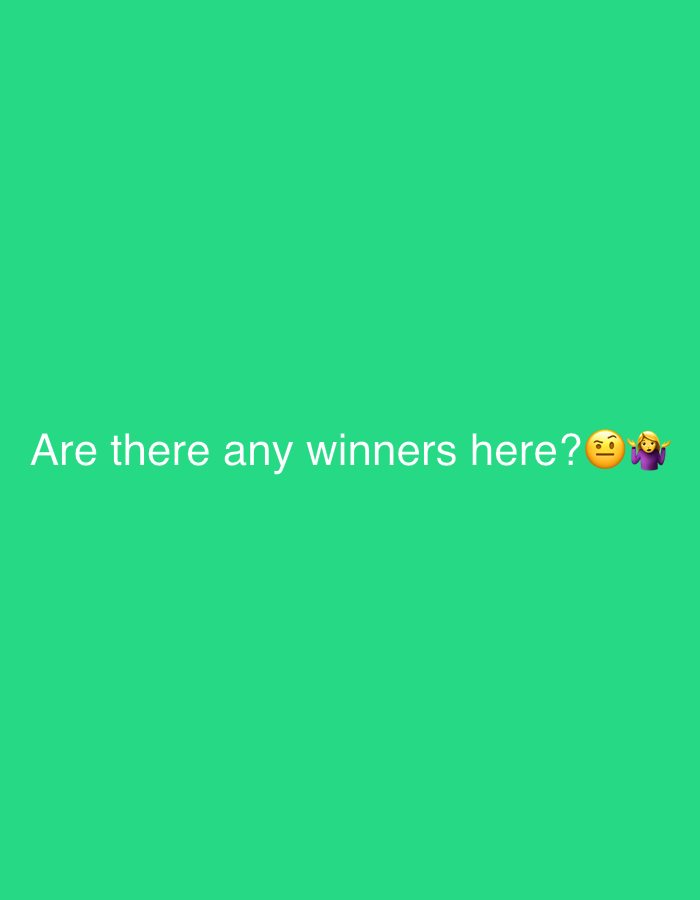 The image, presented as being from the city of Odarne, Bulgaria, displays a solid, uniform green background. Centered horizontally and positioned in the lower half of the frame is a line of white text that reads: "Are there any winners here?". Following this text are two emojis. The first emoji is a yellow circular face, depicted with furrowed brows, eyes looking to the left, and an index finger resting on the chin, commonly known as a "thinking face" emoji. The second emoji portrays a person with blonde hair, wearing a purple top, shrugging with both hands raised and palms open, commonly known as a "person shrugging" emoji. No other objects, subjects, or environmental details are visible.