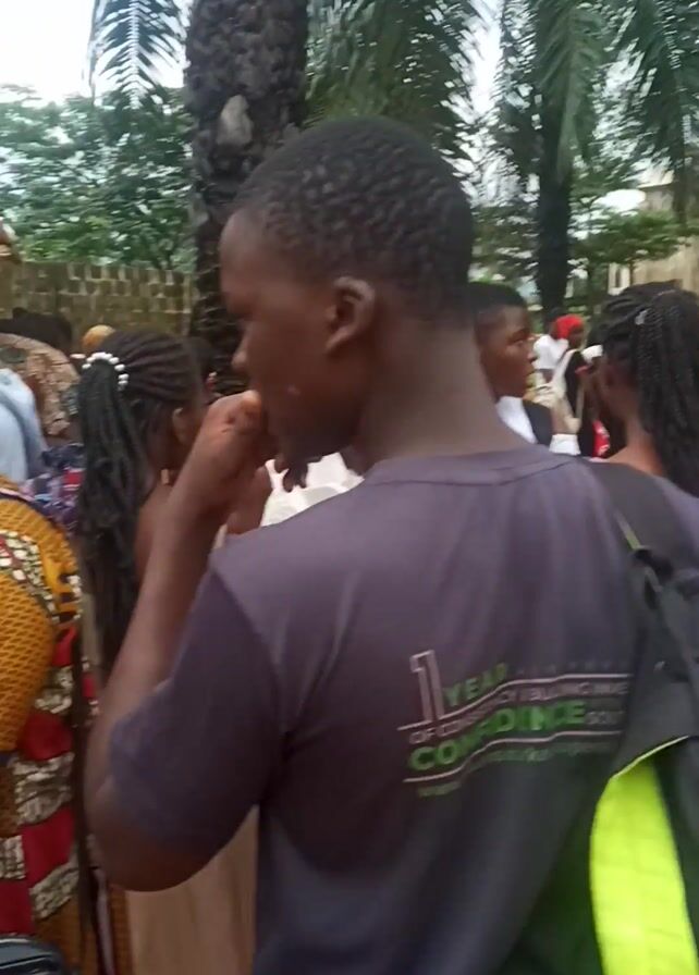 People are gathered outdoors on a partly cloudy day. Some individuals are wearing colorful, patterned clothing. A man is wearing a blue shirt with yellow and red floral patterns. A woman is wearing a yellow, red, and brown patterned dress. Some people are standing near a tent with a blue table inside. A person is wearing a black shirt with a backpack that has a green accent. The ground is reddish-brown and sandy. Several trees are visible in the background.