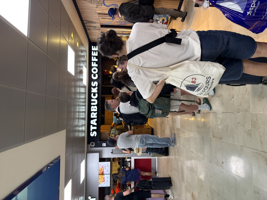 - "A line of people waits at a Starbucks Coffee in an airport" by FM-Gswv13, licensed under CC BY 4.0