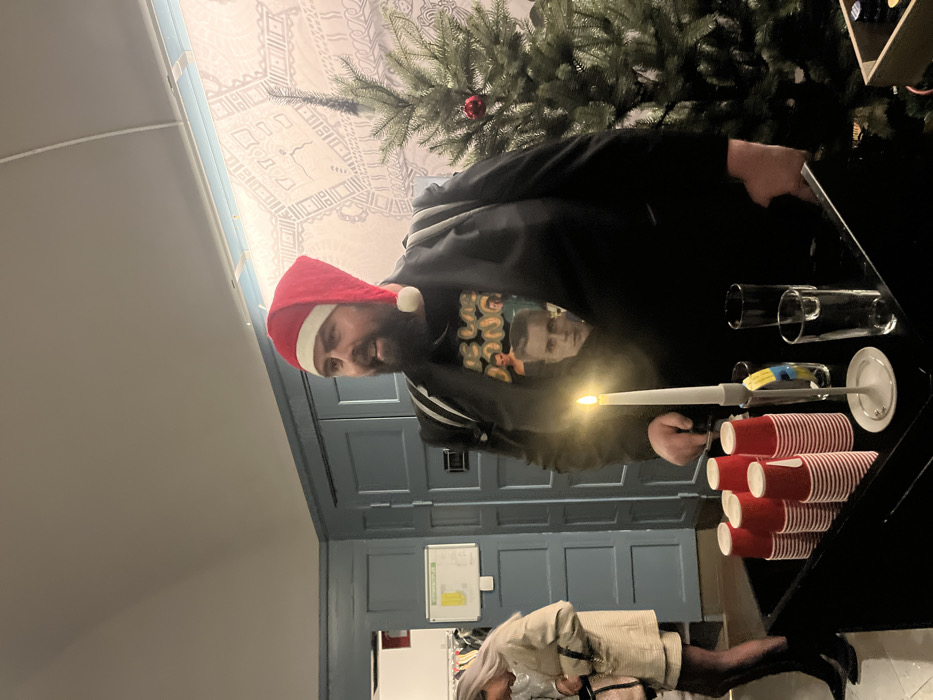 A man wearing a Santa hat and a black jacket stands next to a table with red cups, glasses, and a candle. The room has a Christmas tree in the background. The wall behind the man is blue with paneling and a safety sign. A person with blonde hair wearing a beige coat is in the lower part of the photo.