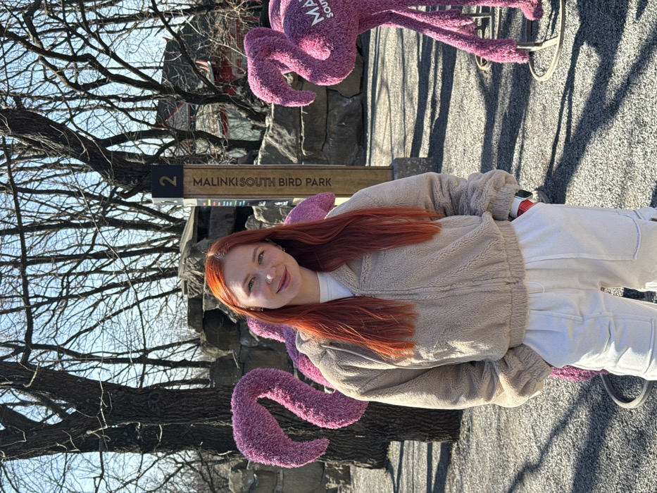 A young adult female with long, straight, vibrant red hair stands centrally, facing forward with a slight smile. She wears a beige, textured, zippered hoodie over a white top and white pants, with her hands in her pockets. A white wristwatch with red details is visible on her left wrist. The setting is an outdoor park or zoo, identified by a wooden signpost directly behind her and to the right, which reads "2" at the top and "MALINKI SOUTH BIRD PARK" vertically. Two large, pink, fuzzy flamingo sculptures are present, one partially visible behind her left shoulder and another on the right, also partially visible and showing "MALINKI SOUTH" on its body. The ground is covered in light-colored gravel or pebbles. In the background, deciduous trees with bare branches are visible against a clear blue sky, along with rocky landscaping and a red building with a pitched roof through the bare trees on the right. Bright sunlight casts shadows on the ground.