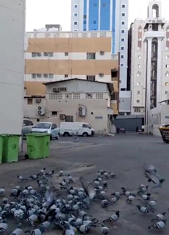 flock of pigeons in an urban environment. The pigeons are in a paved area, perhaps an alley or parking lot, surrounded by buildings of various heights and architectural styles. Some of the buildings appear to be residential or commercial, with windows and air conditioning units visible. There are green trash bins on the left side of the screen and vehicles parked nearby. As the video progresses, the pigeons are startled and take flight, filling the frame with flapping wings before settling back down. The sky is overcast, creating a muted light.