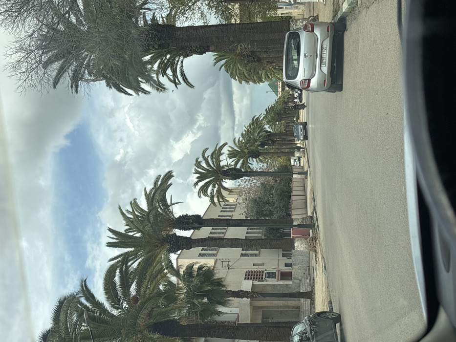 This image depicts a daytime street scene in Meknes, Morocco. The perspective is from the interior of a vehicle, with part of the dashboard visible at the bottom. The street is a paved asphalt road, extending into the distance under a sky with both blue patches and heavy, grey clouds. Tall palm trees line both sides of the road, creating an avenue effect, with some leafless deciduous trees also present on the right. On the left side of the road, a dark-colored hatchback is partially visible, parked parallel to the curb. Behind it, a multi-story building with a light-colored facade, multiple rectangular windows, and an entrance with steps is visible. A red utility box is positioned at the base of one of the palm trees on the left sidewalk. Further down the street on the left, a pedestrian is visible walking on the sidewalk. On the right side of the road, a silver Dacia Sandero hatchback (Moroccan license plate 62781 111-20) is parked parallel to the curb, facing away from the camera. A low wall or fence runs alongside the right sidewalk, separating it from an unseen property. Traffic is present on the road. A dark-colored sedan is approaching in the left lane, and a person on a motorcycle or scooter is traveling away from the camera in the right lane. Several other vehicles are discernible further down the street. Streetlights are intermittently spaced among the palm trees.