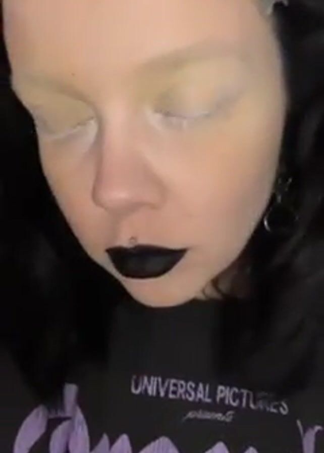 A close-up shot shows a person with black hair wearing a black "Universal Pictures presents Dracula" t-shirt. Their eyebrows and eyelashes are bleached or covered with a white substance. They are wearing black lipstick. The person squints one eye at the camera. Hair clips are visible in their hair near the forehead. The background appears to be a dark room.