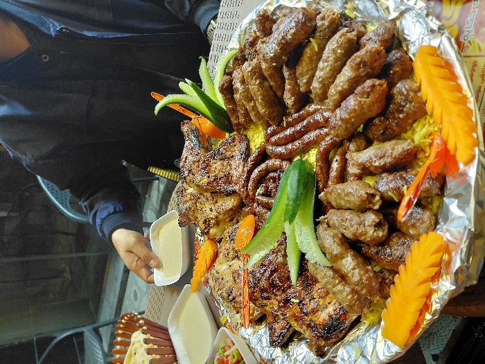 - "A large platter overflows with grilled meats, including chicken, sausages, and kofta kebabs" by FM-ttalh2, licensed under CC BY 4.0