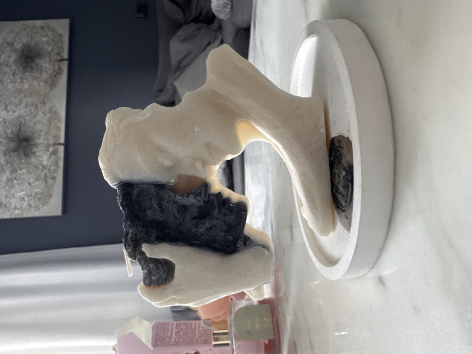 This image depicts an indoor scene in Zhiten, Bulgaria, primarily focused on a sculptural candle on a white tabletop. The central object is a two-toned candle, carved in the likeness of two human profiles facing each other, appearing to be in an embrace or kiss. The figure on the right is uniformly cream-colored, while the figure on the left is also cream-colored but features textured dark grey/black wax for hair or an obscured portion of its face. A wick is visible protruding from the top of the dark-haired section of the left figure. The sculpture rests on a circular, white, unglazed ceramic or concrete tray. Directly beneath the base of the sculpture on this tray, a pool of dark, solidified wax residue is present, indicating the candle has been partially burned. To the left of the candle, partially obscured, are a light pink cardboard box with text and a glass perfume bottle with a golden cap. The tabletop surface is white with subtle grey veining, suggesting marble or a similar material. In the background, a dark blue wall is visible, on which a large, rectangular piece of abstract wall art, possibly depicting light-colored dandelion-like structures on a light grey background, is hung. To the far right background, a grey upholstered sofa with throw pillows is partially visible, indicating a living space. The lighting is soft and ambient.