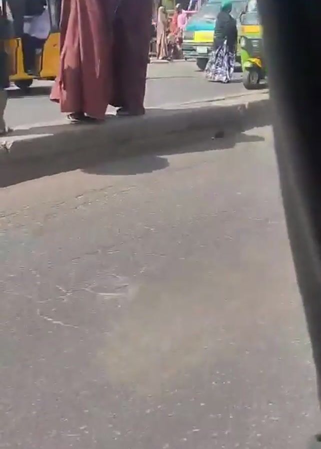 street scene in what appears to be a busy urban area. Various people, including men and women in traditional attire, are walking or standing on the sidewalk beside the road. Several yellow and green auto rickshaws, a type of three-wheeled vehicle commonly used as taxis, are visible on the road and near the sidewalk. A motorcycle is also visible, parked next to the curb. There are buildings visible in the background, with one prominent sign reading "NIFOAM." The camera appears to be inside a moving vehicle. The overall impression is that of a typical street scene in a West African city.