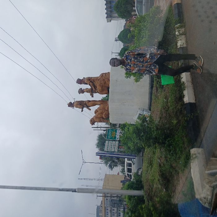 A man in a patterned shirt and black pants stands next to a statue depicting figures on horses. The statue is situated on a concrete base surrounded by greenery. Overhead, power lines stretch across the sky. In the background, there's a street scene with buildings, signs, a white van, and a light pole. The weather appears overcast.