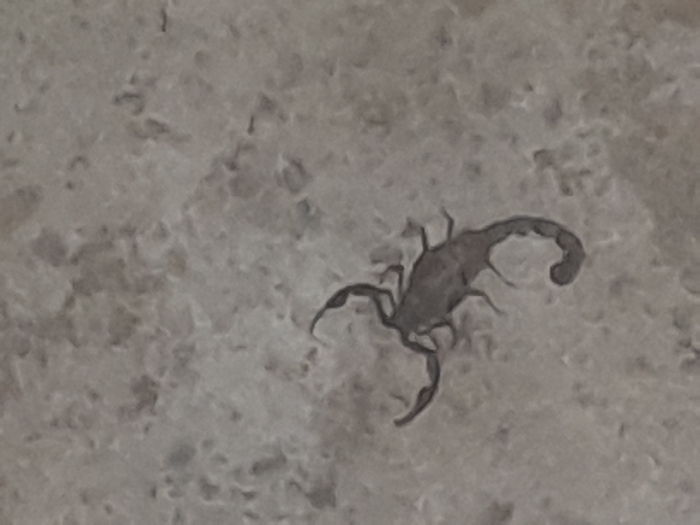 - "A dark-colored scorpion is positioned centrally on a light grey, textured surface, consistent with concrete or matte-finished tile, in Jos, Nigeria" by FM-pj7U93, licensed under CC BY 4.0